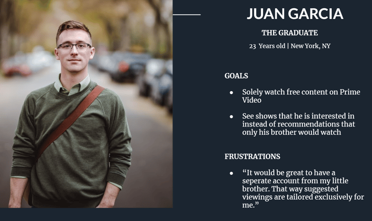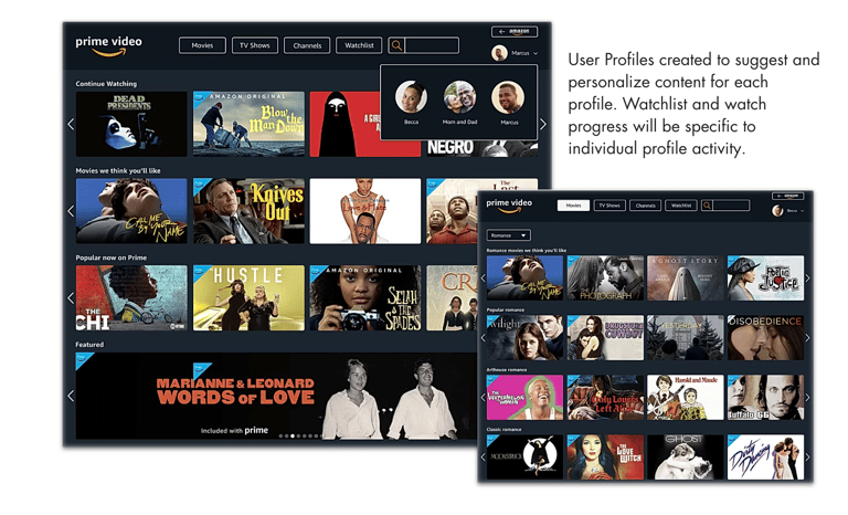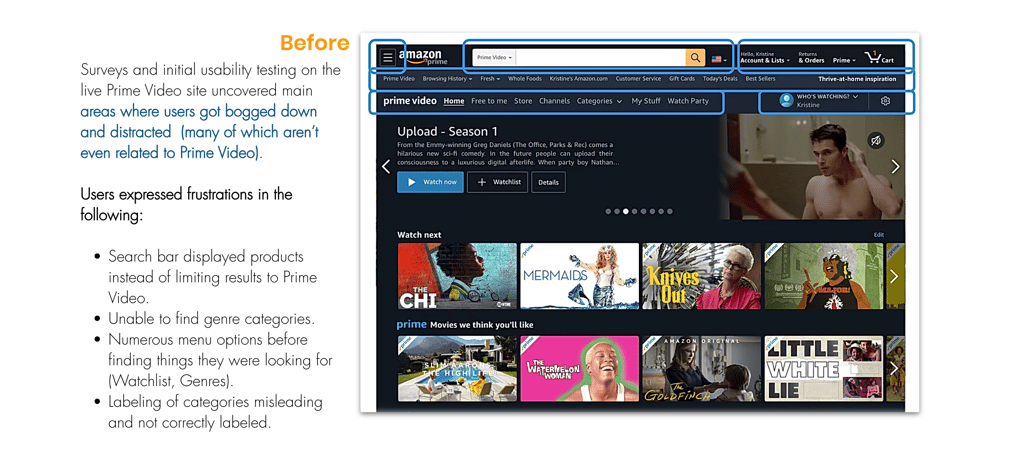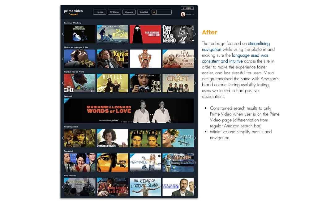 While redesigning the Prime Video site, Amazon did the same, and the design team noticed many changes to the live site while doing further research and iterations of design. They had incorporated many of the redesign ideas we derived at, such as a sticky navigation to eliminate the overcomplicated options, user profiles in order to switch between accounts and have minimized the features of paid content and pushing more "free with prime" content. This proved the team was headed in the right direction in our research and design decisions.