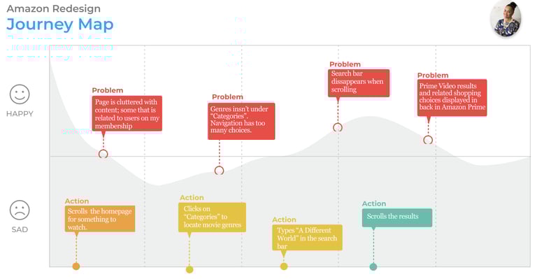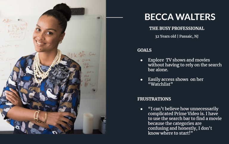 After analyzing user interviews, and survey data responses, two primary personas we identified and the focus was put on Becca's user journey to identify her pain points when looking for a movie to watch.