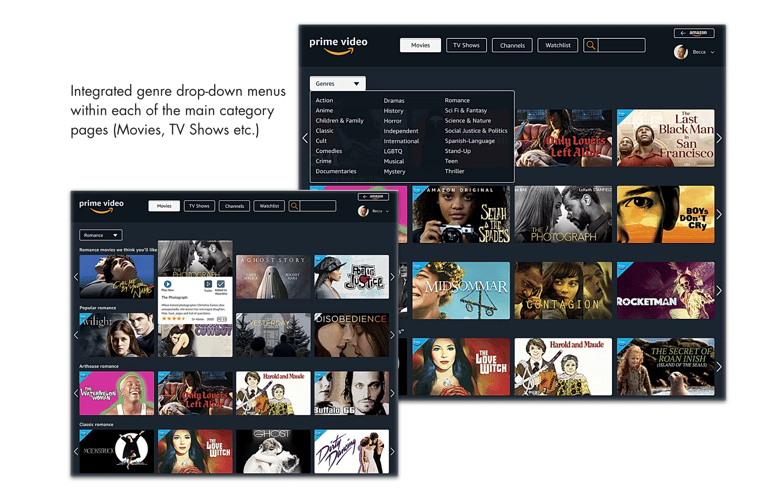 I performed usability testing on the Mid-Fi wireframes to measure the success of users being able to access a specific user profile, utilize the genre dropdown menu and return to the main Amazon shopping site. The creation of a general dropdown menu was to shift reliance on the search bar in lieu of the numerous categories and genres the Prime Video previously offered.